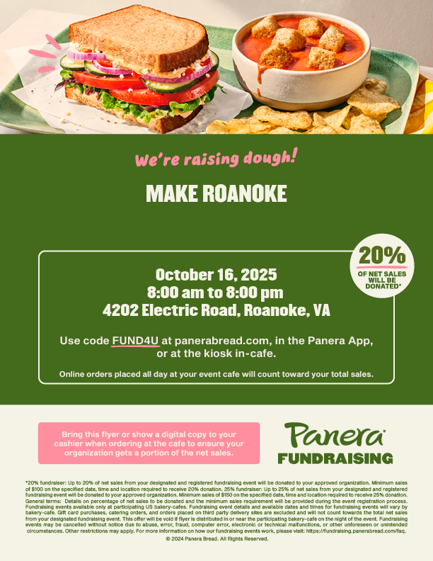 Panera will donate 20% of the proceeds to MAKE Roanoke!