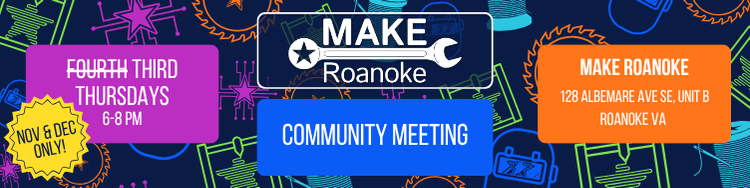 MAKE Roanoke’s Community Meeting for November and December will be held on the THIRD Thursday to accommodate the holidays (instead of the usual fourth thursday). They will still be at our location: 128 Albemarle Ave SE, Unit B in Roanoke!