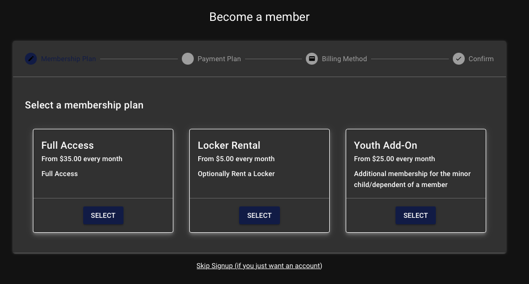 Then, select “Full Access” to sign up for your primary membership. If you have a youth access add-on, you’ll click “Youth Add-On” from the youth member’s account (You can also keep Youth Access Add-Ons on PayPal until we add the ability to do multiple membership types on one account).