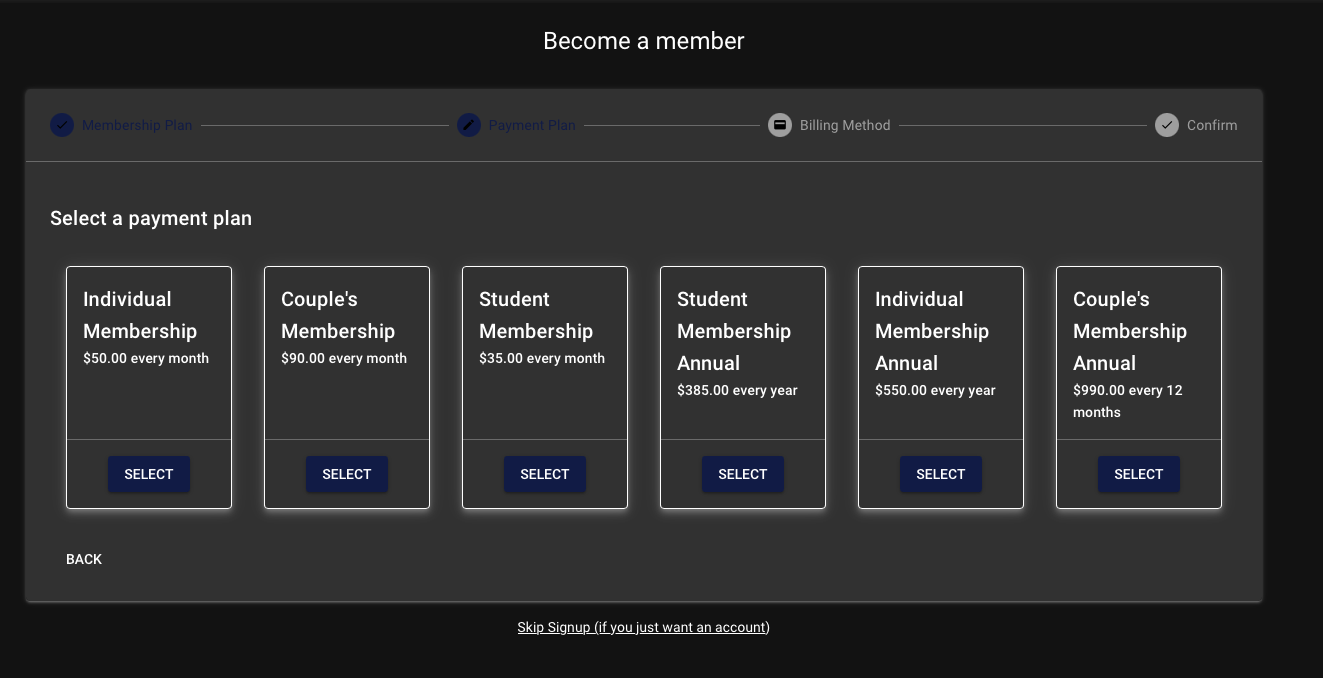 Then select the type of membership you are signing up for. This will give you the opportunity to switch to an annual membership. NOTE: Only one member needs to pay for Couple’s Memberships!