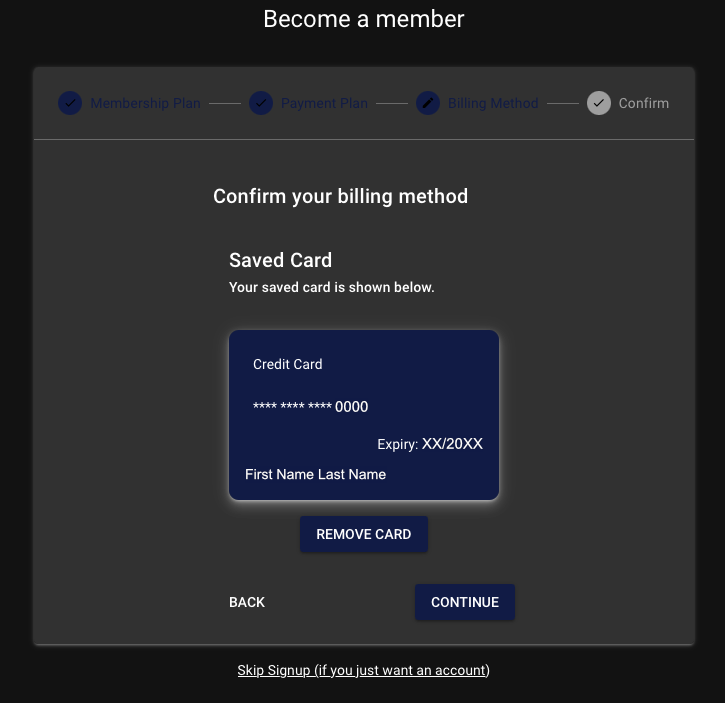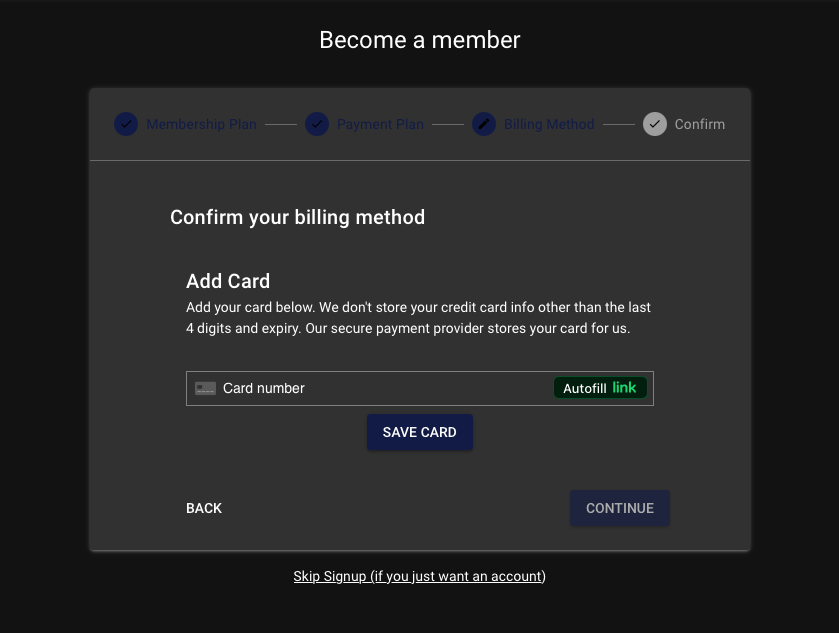 Then type in your payment card information, click “SAVE CARD”, then click “CONTINUE”: