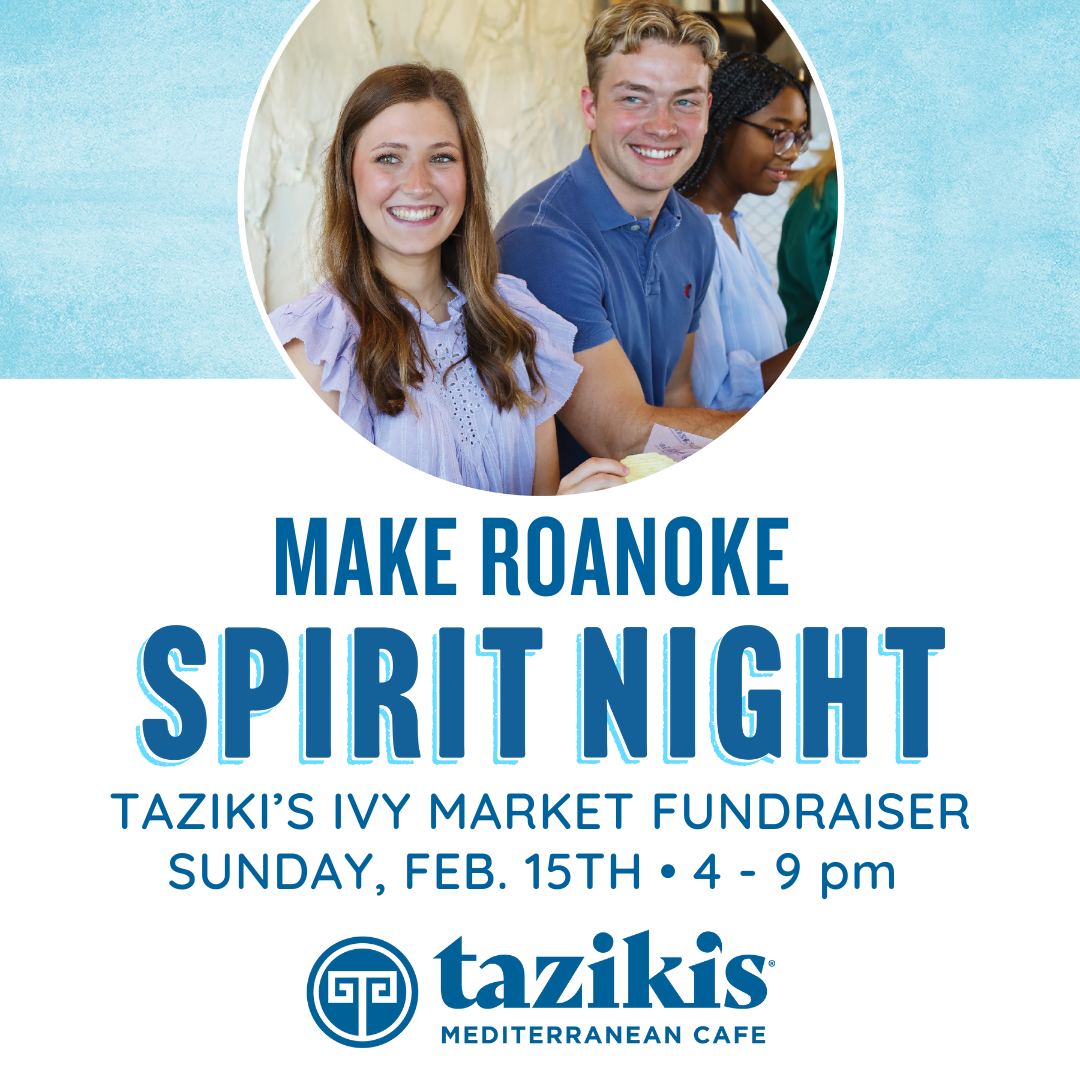 MAKE Roanoke is hosting a fundraiser at Taziki’s Ivy Market on Sunday, February 15 from 4-9 PM!